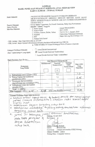 Yogaswara, Novan Satria and Gunawan, Go Frendi and Purwiantono, Febry Eka Peer Review: Prototype Penjemur Pakaian Otomatis Berbasis Microcontroller Arduino dengan Metode Naive Bayes Serta Menggunakan Sensor LDR dan Sensor Kelembaban Udara DHT11. STIKI Malang.