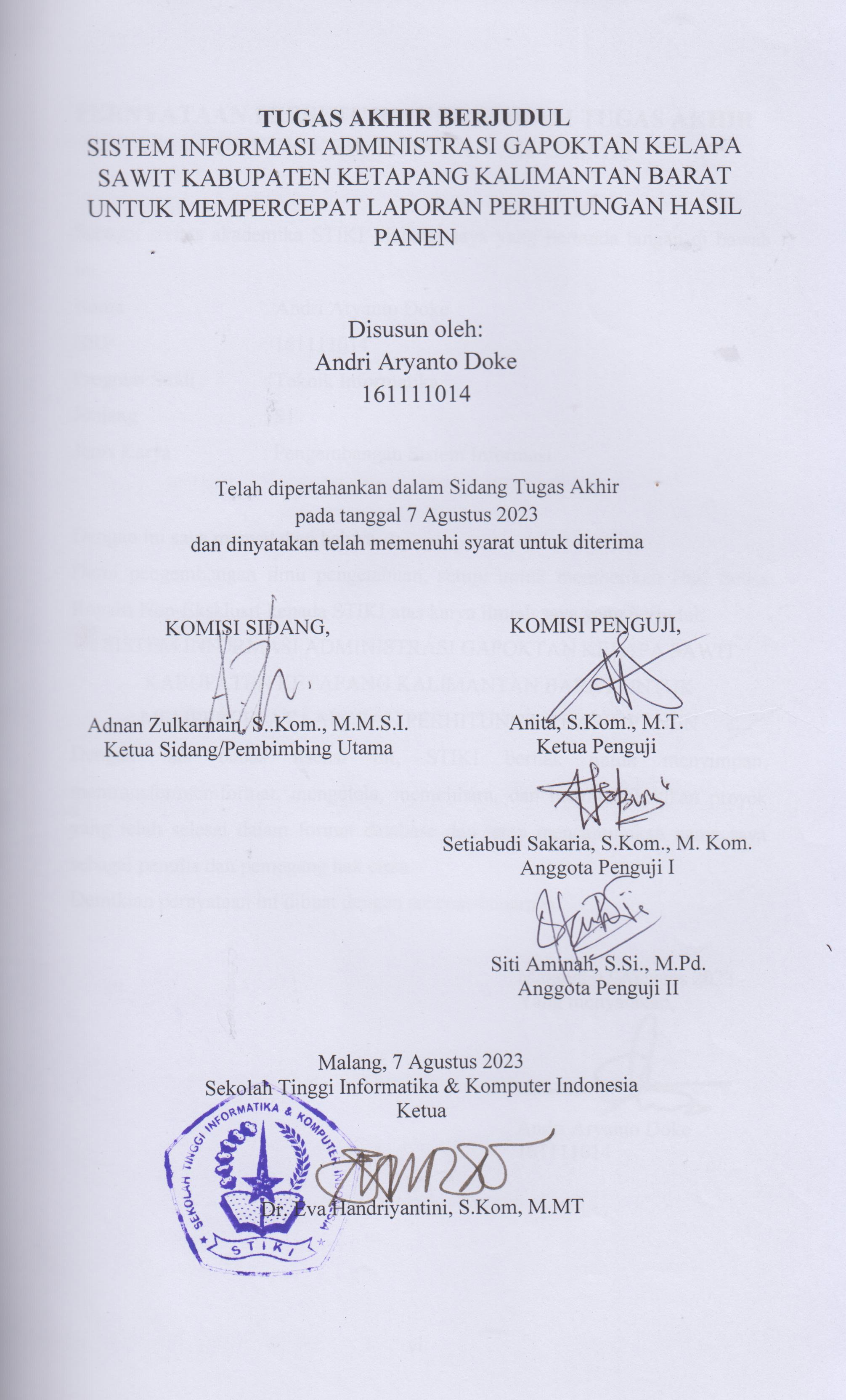 Andri Aryanto, Doke (2023) SISTEM INFORMASI ADMINISTRASI GAPOKTAN KELAPA SAWIT KABUPATEN KETAPANG KALIMANTAN BARAT UNTUK MEMPERCEPAT LAPORAN PERHITUNGAN HASIL PANEN. Sarjana thesis, Sekolah Tinggi Informatika & Komputer Indonesia.