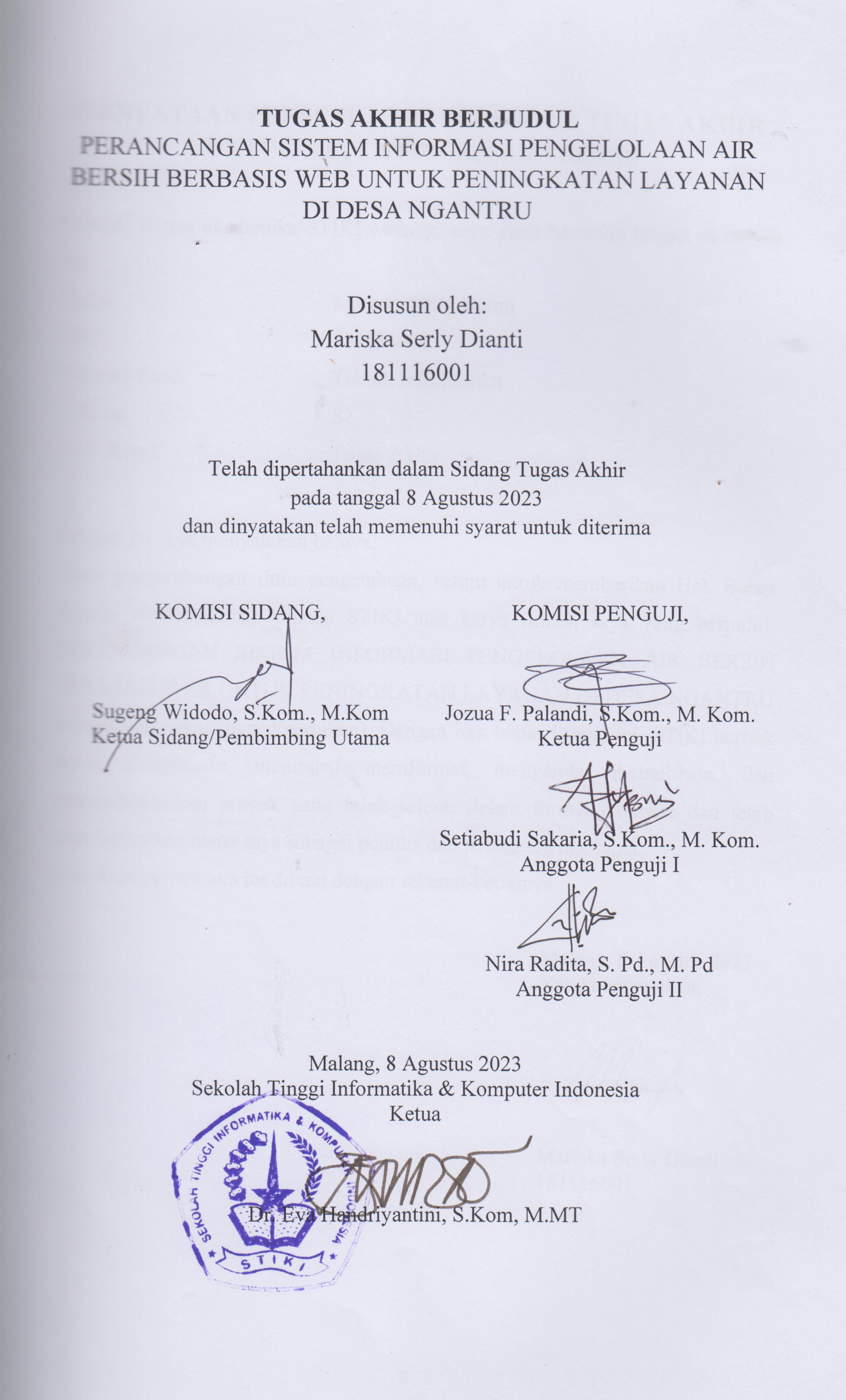 Mariska Serly, Dianti (2024) PERANCANGAN SISTEM INFORMASI PENGELOLAAN AIR BERSIH BERBASIS WEB UNTUK PENINGKATAN LAYANAN DI DESA NGANTRU. Sarjana thesis, Sekolah Tinggi Informatika & Komputer Indonesia.