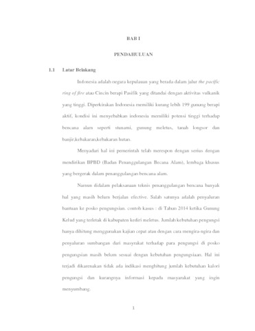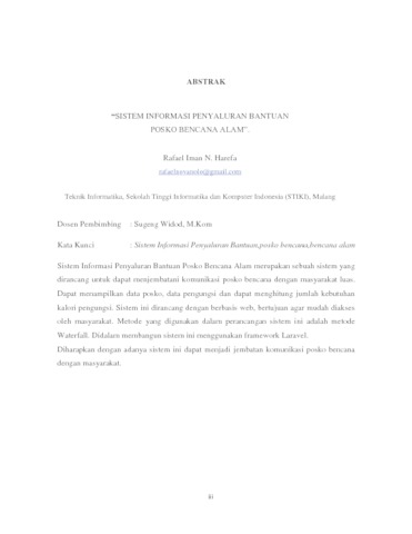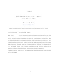 Kata Kunci : Sistem Informasi Penyaluran Bantuan,posko bencana,bencana alam Sistem Informasi Penyaluran Bantuan Posko Bencana Alam merupakan sebuah sistem yang dirancang untuk dapat menjembatani komunikasi posko bencana dengan masyarakat luas. Dapat menampilkan data posko, data pengungsi dan dapat menghitung jumlah kebutuhan kalori pengungsi. Sistem ini dirancang dengan berbasis web, bertujuan agar mudah diakses oleh masyarakat. Metode yang digunakan dalam perancangan sistem ini adalah metode Waterfall. Didalam membangun sistem ini menggunakan framework Laravel. Diharapkan dengan adanya sistem ini dapat menjadi jembatan komunikasi posko bencana dengan masyarakat.