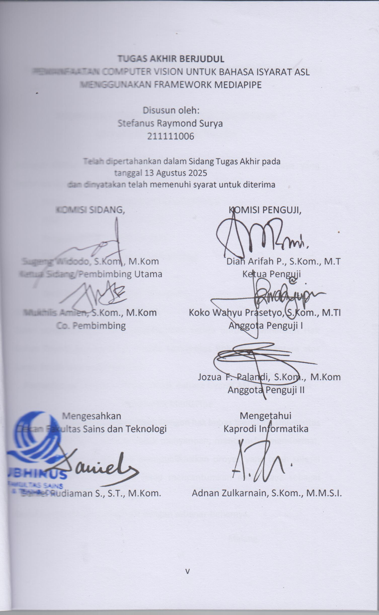 Surya, Stefanus Raymond (2025) PEMANFAATAN COMPUTER VISION UNTUK BAHASA ISYARAT ASL MENGGUNAKAN FRAMEWORK MEDIAPIPE. Sarjana thesis, Universitas Bhinneka Nusantara.