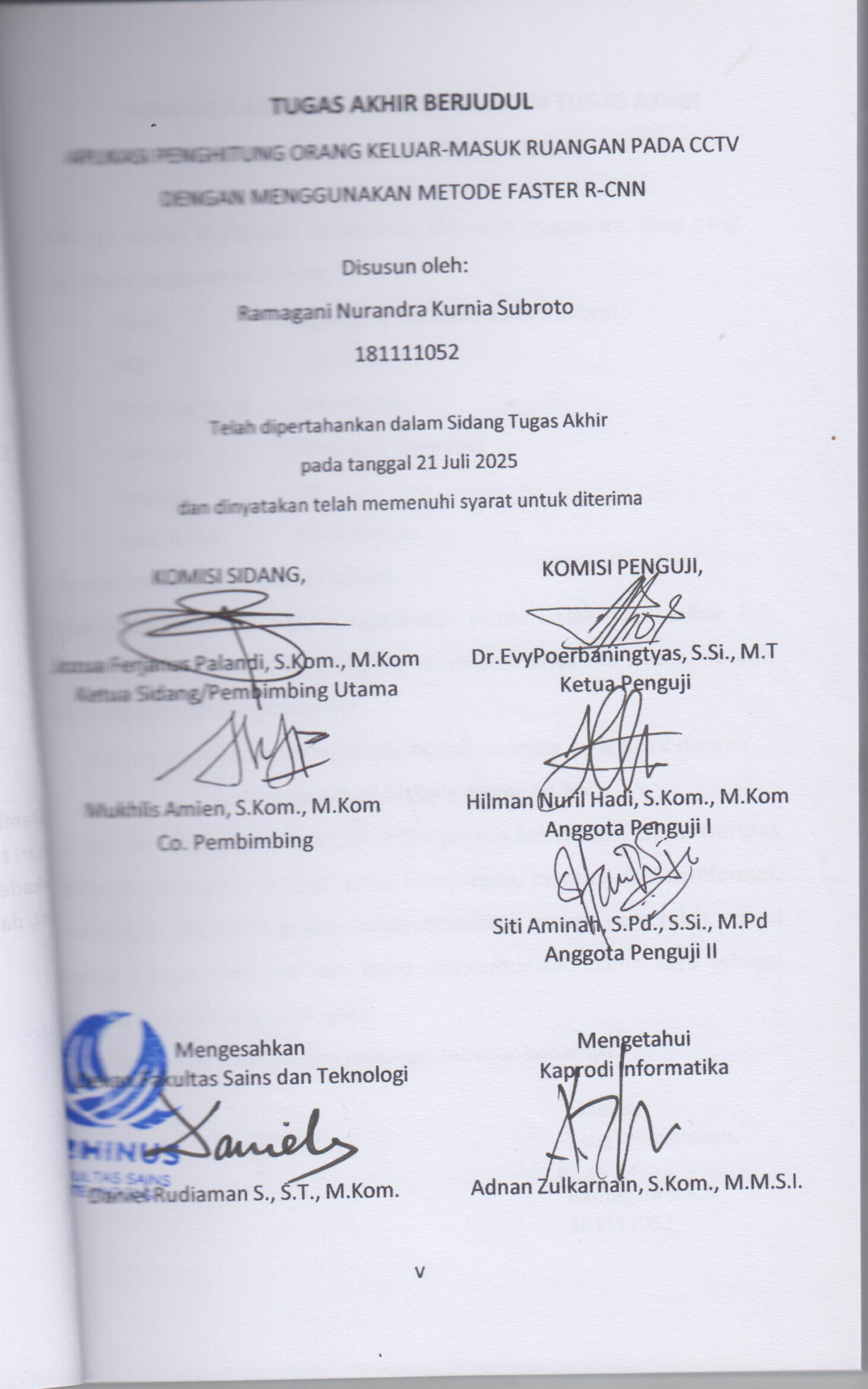 Penelitian ini mengembangkan aplikasi penghitung orang keluar- masuk ruangan secara otomatis menggunakan rekaman CCTV dengan metode Faster R- CNN. Sistem ini bertujuan menggantikan pengawasan manual yang rawan kesalahan, terutama pada kondisi kerumunan. Algoritma Faster R-CNN digunakan untuk mendeteksi objek manusia dengan menggunakan fitur visual dari setiap frame video yang kemudian dianalisis dalam sistem real-time. Aplikasi ini dibangun menggunakan framework Flask sebagai antarmuka web dan PyTorch sebagai platform pelatihan dan inferensi model deteksi. Rekaman CCTV yang diproses berasal dari ruangan tertutup dengan pencahayaan stabil. Evaluasi dilakukan terhadap akurasi deteksi, jumlah orang yang masuk dan keluar ruangan, serta performa sistem dalam berbagai kondisi pencahayaan dan kepadatan orang. Hasil pengujian menunjukkan bahwa sistem mampu menghitung jumlah orang secara akurat dan efisien serta memberikan hasil secara real-time. Penelitian ini diharapkan menjadi solusi monitoring modern yang adaptif terhadap kebutuhan manajemen ruang dan keamanan pengguna di fasilitas publik.