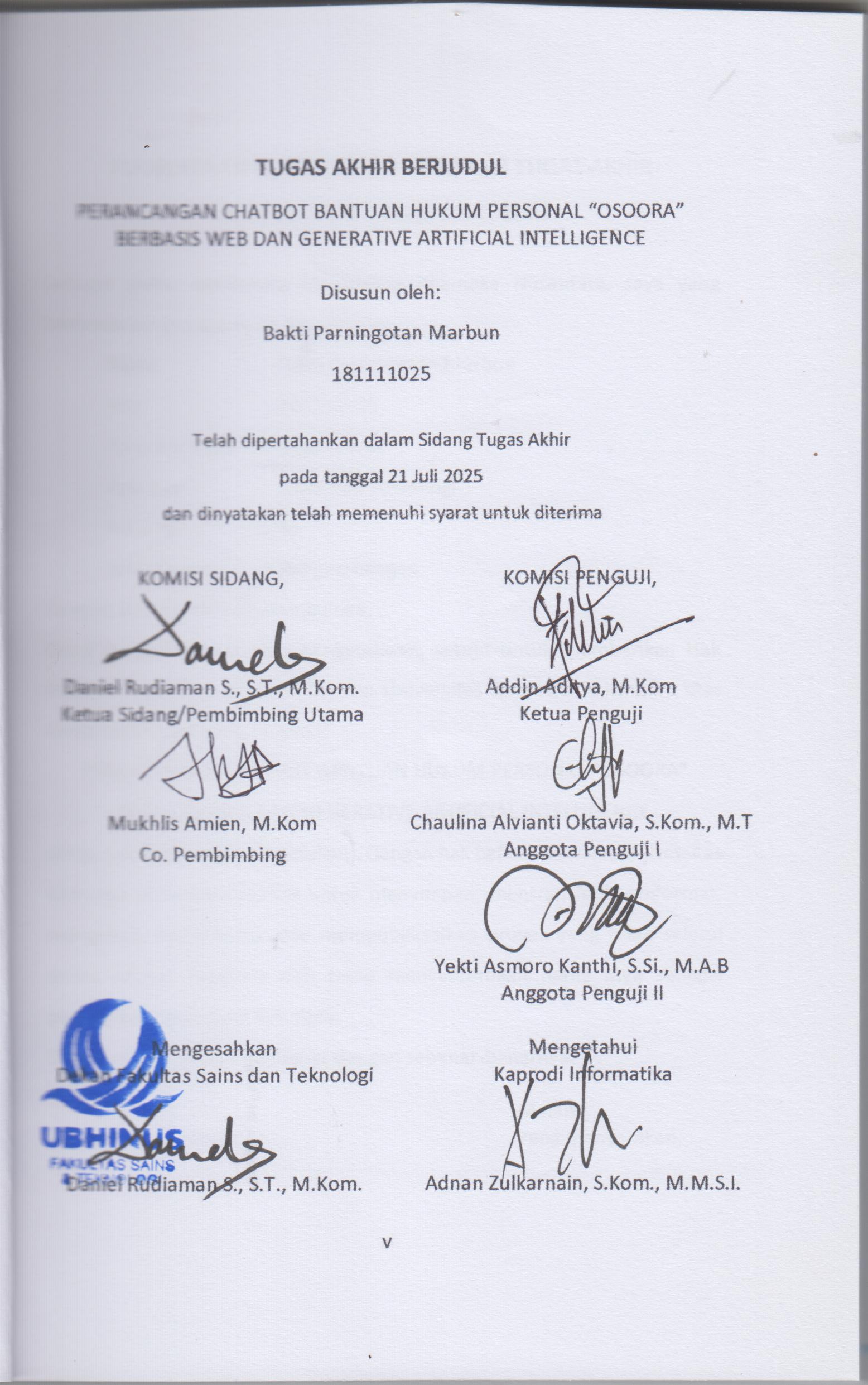 Marbun, Bakti Parningotan (2025) PERANCANGAN CHATBOT BANTUAN HUKUM PERSONAL “OSOORA” BERBASIS WEB DAN GENERATIVE ARTIFICIAL INTELLIGENCE. Sarjana thesis, Universitas Bhinneka Nusantara.
