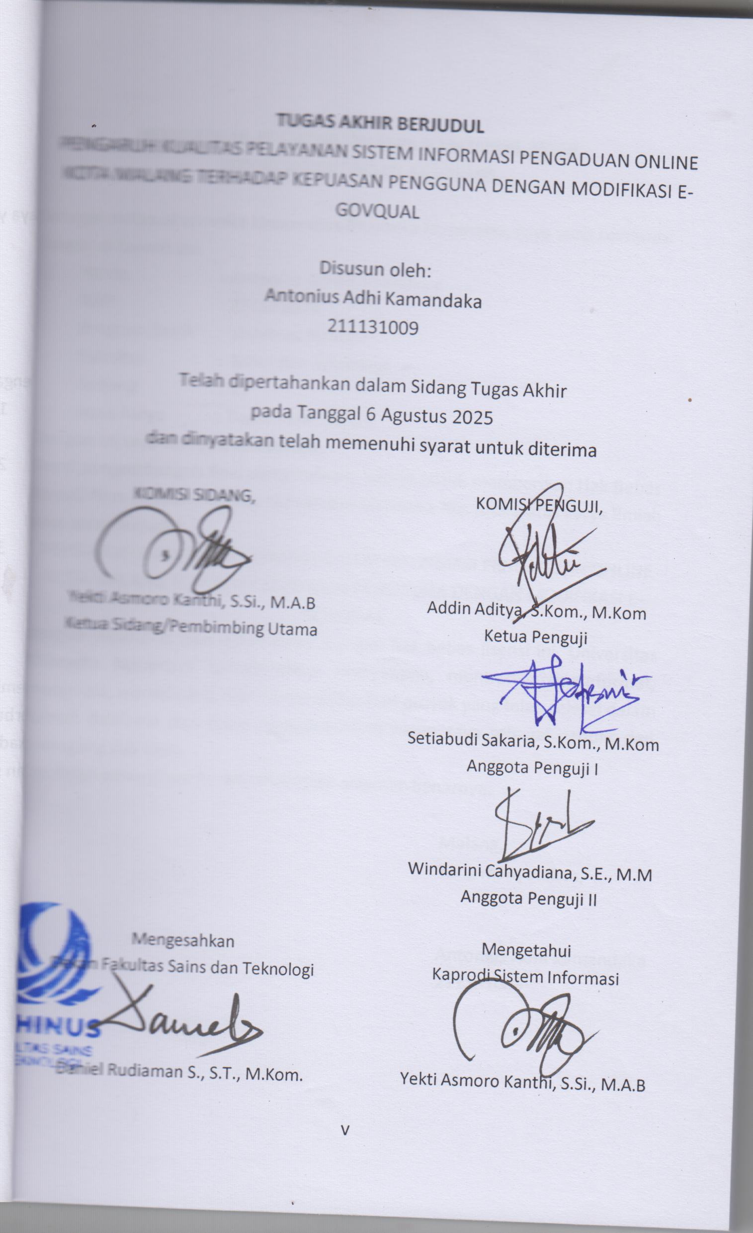 Kamandaka, Antonius Adhi (2025) PENGARUH KUALITAS PELAYANAN SISTEM INFORMASI PENGADUAN ONLINE KOTA MALANG TERHADAP KEPUASAN PENGGUNA DENGAN MODIFIKASI E- GOVQUAL. Sarjana thesis, Universitas Bhinneka Nusantara.