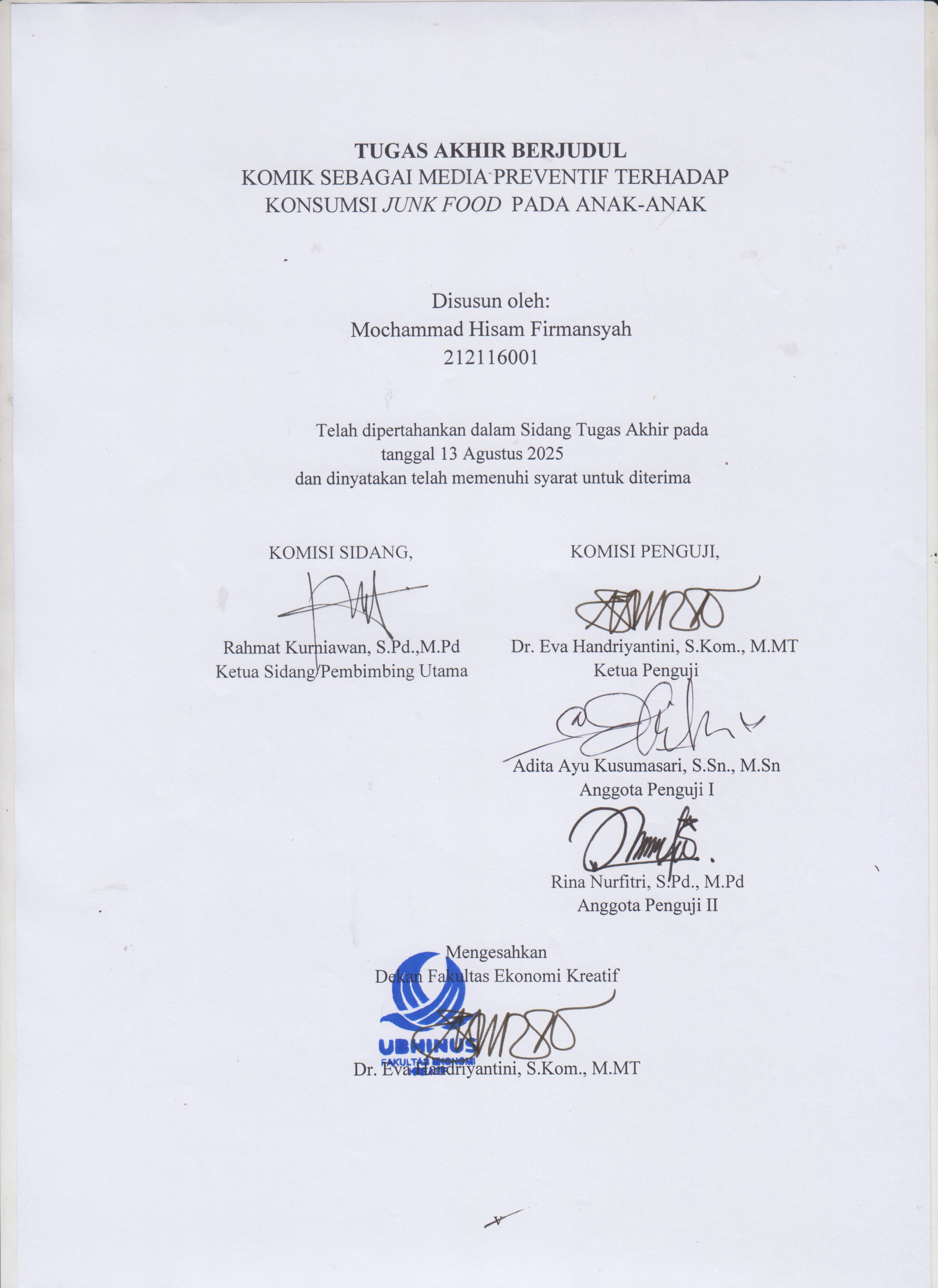 Firmansyah, Mochammad Hisam (2025) KOMIK SEBAGAI MEDIA PREVENTIF TERHADAP KONSUMSI JUNK FOOD PADA ANAK-ANAK. Sarjana thesis, UNIVERSITAS BHINNEKA NUSANTARA.
