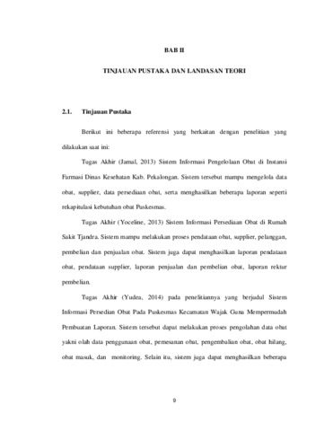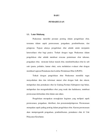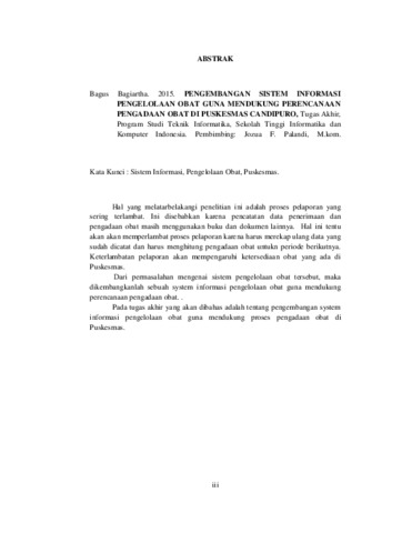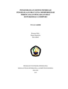 Hal yang melatarbelakangi penelitian ini adalah proses pelaporan yang sering terlambat. Ini disebabkan karena pencatatan data penerimaan dan pengadaan obat masih menggunakan buku dan dokumen lainnya. Hal ini tentu akan akan memperlambat proses pelaporan karena harus merekap ulang data yang sudah dicatat dan harus menghitung pengadaan obat untukn periode berikutnya. Keterlambatan pelaporan akan mempengaruhi ketersediaan obat yang ada di Puskesmas. Dari permasalahan mengenai sistem pengelolaan obat tersebut, maka dikembangkanlah sebuah system informasi pengelolaan obat guna mendukung perencanaan pengadaan obat. Pada tugas akhir yang akan dibahas adalah tentang pengembangan system informasi pengelolaan obat guna mendukung proses pengadaan obat di Puskesmas.