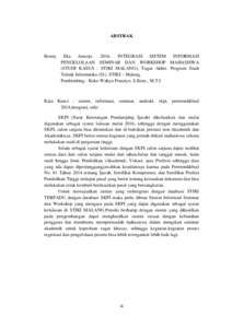 Kata Kunci : sistem, informasi, seminar, android, skpi, permendikbud 2014,integrasi, stiki SKPI (Surat Keterangan Pendamping Ijazah) dikeluarkan dan mulai digunakan sebagai syarat lulusan mulai 2016, sehingga dengan menggunakan SKPI, calon sarjana bisa ditentukan dan di buktikan prestasi non-Akademik dan Akademiknya. SKPI berisi semua kegiatan yang pernah diikuti mahasiswa selama melakukan studi di perguruan tinggi. Selain sebagai syarat kelulusan dengan SKPI calon sarjana dapat melihat semua data dari calon sarjana mulai dari tahun,bulan dan tanggal masuk, lama studi hingga Jenis Pendidikan (Akademik, Vokasi, atau Profesi) sehingga data yang ada dapat dipertanggungjawabkan keasliannya karena pada Permendikbud No. 81 Tahun 2014 tentang Ijazah, Sertifikat Kompetensi, dan Sertifikat Profesi Pendidikan Tinggi terdapat pasal yang berisi tentang kerusakan dokumen dan bisa melakukan cetak kembali berdasarkan pasal yang bersangkutan. Untuk mewujudkan sistem yang terintegrasi dengan database STIKI TERPADU dengan database SKPI maka perlu dibuat Sistem Informasi Seminar dan Workshop yang mengacu pada SKPI yang dapat digunakan sebagai syarat kelulusan di STIKI MALANG.Penulis berharap dengan sistem yang dihasilkan pada pengembangan dapat menghasilkan sistem sesuai dengan kebutuhan pengguna dan membantu mempermudah mahasiswa dalam mengikuti seminar akademik untuk keperluan tugas khusus, sehingga kegiatan-kegiatan proses registrasi dan pengelolaan peserta bisa lebih terorganisir lebih baik lagi.