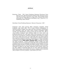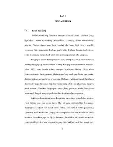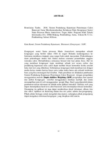 Kata Kunci: Sistem Pendukung Keputusan, Biarawati, Kongregasi, SAW. Kongregasi suster Santa perawan Maria Amersfoort merupakan sebuah kongregasi yang berdiri tahun 1926 di negeri Belanda kedatangannya ke Indonesia membawa dampak yang sangat baik untuk masyarakat. Perkembangan demi pekembagan makin hari makin meluas terutama penambahan anggota terutama calon. Bertambahnya semuanya berasal dari luar pulau Jawa. Hal ini yang membuat kongregasi ingin membuat sebuah test secara online dan pendukung keputusan serta calon dapat melihat lokasi komunitas ketika setelah lulus dari test yang diberikan. Sebelumnya kongregasi telah membuat test dengan media kertas namun karena biaya serta waktu maka harus ada sebuah terobosan baru yang bisa menangani hal tersebut. Pada penelitian ini dilakukan pembuatan Sistem Pendukung Keputusan Penerimaan Calon Biarawati dengan pengolahan menggunakan metode Simple Additive Weighting (SAW) pengolahan data spasial dan atribut Kongregasi tersebut menggunakan database mySQL dan untuk menampilkan peta di web menggunakan google Map. Hasil yang diperoleh dalam pembuatan sistem informasi ini adalah suatu aplikasi interaktif berbasis web yang dapat menunjukkan hasil test calon biarawati serta menunjukan lokasi komunitas. Disamping itu aplikasi ini juga dapat memberikan detail informasi, album foto dan video. Aplikasi ini dirancang dalam dua sisi yakni: admin dan pengunjung. Pihak admin bertugas untuk mengolah data master, sedangkan pihak pengunjung dapat mengakses informasi kongregasi yang disajikan oleh sistem.